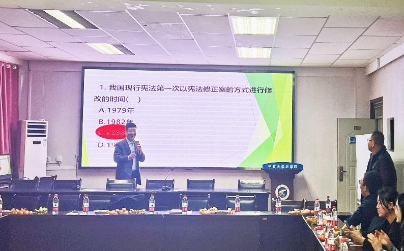 会上,院长马红彬汇报了学院一年来工作开展情况,重点从教育教学、科研工作、人才培养以及人才引进等方面做了总结,向教职工通报了2023年学院的工作和取得的成绩。学院领导向全体教师致以诚挚的感谢和新年的祝福。此次茶话会不仅是一个欢聚的时刻,更是一个交流与学习的平台。在茶话会上,学院开展了宪法知识趣味竞赛、乒乓球活动等,让与会教师在轻松愉快的氛围中度过了一个难忘的时光。教师积极参与了宪法知识趣味竞赛环节,竞赛以趣味有奖竞答的形式展开,内容涵盖了宪法、法规等相关的知识。通过竞赛活动,增强了教师自身的法治观念,提高法律素养。乒乓球比赛不仅提高了教师的身体素质,还增进了彼此之间的交流与合作,加强了团队凝聚力。