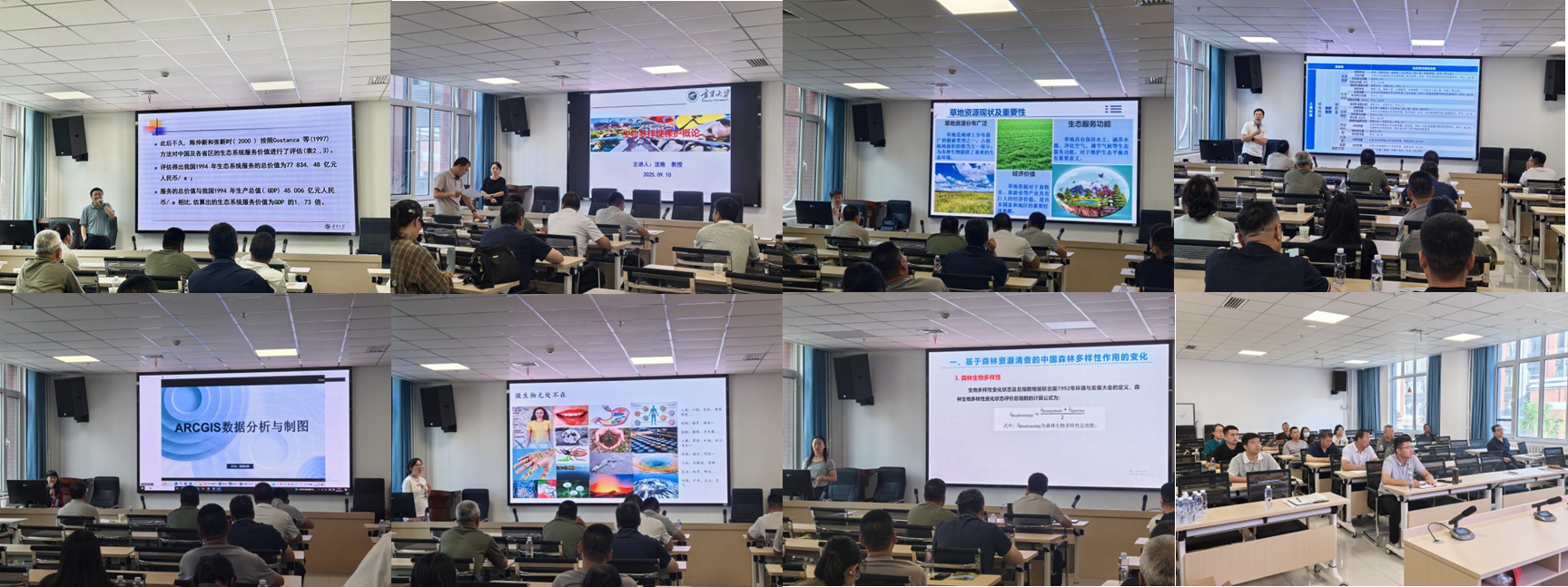在后续的培训中,学院马红彬教授、沈艳教授、李小伟教授、王国会副教授、米楠副教授、李慧萍博士、何莹莹博士分别以《自然保护区生态服务和生态价值评估》、《生物多样性保护概论》《草地植物多样性监测及保护》、《保护区环境监测与调查》、《ArcGIS应用、林草遥感和智慧林草》、《林草生态系统微生物及其多样性》、《森林(林地)多样性监测与保护》为主题,系统阐述了生物多样性的概念、价值以及面临的挑战,使学员们对生物多样性保护有了全面而深入的了解,并结合实际案例,详细讲解了方法和技术,为学员们在实际工作中开展环境监测提供了有力的指导。