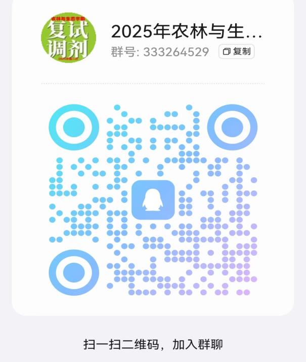 请接到调剂复试通知并确认参加复试的考生,尽快加入“2025年农林与生态学部调剂复试QQ群”(群号:333264529,群二维码见下图),以便接收相关通知。进群后,请更改昵称为“姓名+林草学院+草学+联系电话”。新葡京娱乐城
