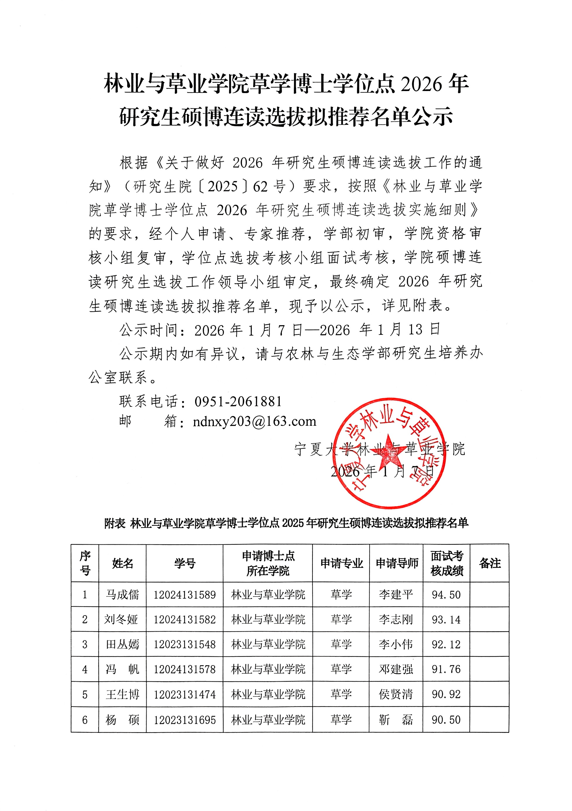 新葡京娱乐城 草学博士学位点2026年研究生硕博连读选拔拟推荐名单公示