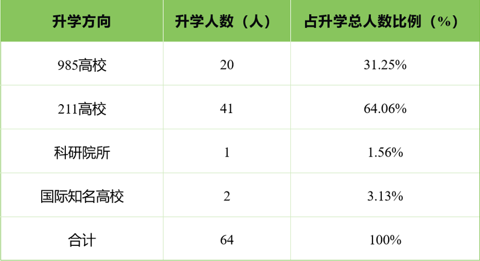 学院本年度共有本、硕、博毕业生188人,其中本科生102人(占比54.26%),硕士研究生85人(占比45.21%),博士研究生1人(占比0.53%)。截至目前,共64名毕业生成功升学。其中,本科生升学59人,升学率达57.84%;硕士研究生升学5人,升学率达5.88%。从升学层次来看,考入985高校的有20人,占升学总人数的31.25%;考入211高校的有41人,占升学总人数的64.06%;另有2人考入国际知名院校,1人考入科研院所,升学结构多元优质,高层次深造比例突出。
