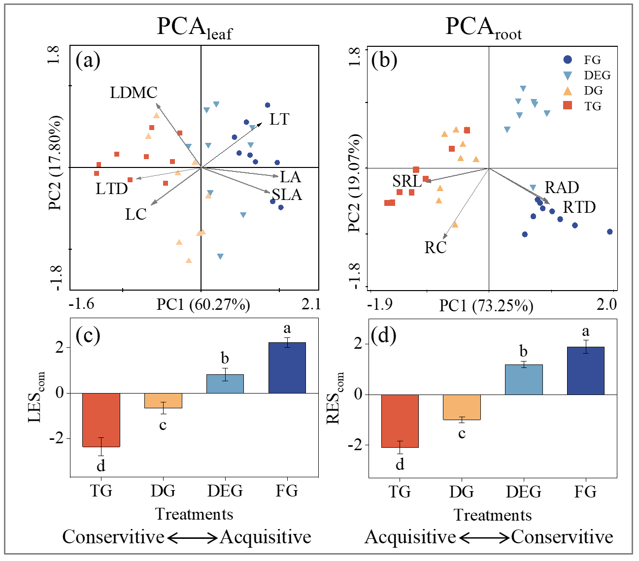 结果发现,放牧改变了整株植物的经济谱,草地植物的叶片和根形成了独立的资源获取策略,即随着放牧时间的增加,叶片性状从相对获取型转向相对保守型资源获取策略,而根系性状则从相对保守型转向相对获取型资源获取策略。植物可以通过发展高叶片防御组织(高叶组织密度)和高营养吸收组织(高比根长)的生存策略组合,并通过个体小型化(低比叶面积)避免牲畜取食。本研究为不同放牧时间下叶片和根系资源的获取和利用方式相对独立提供了新的证据。