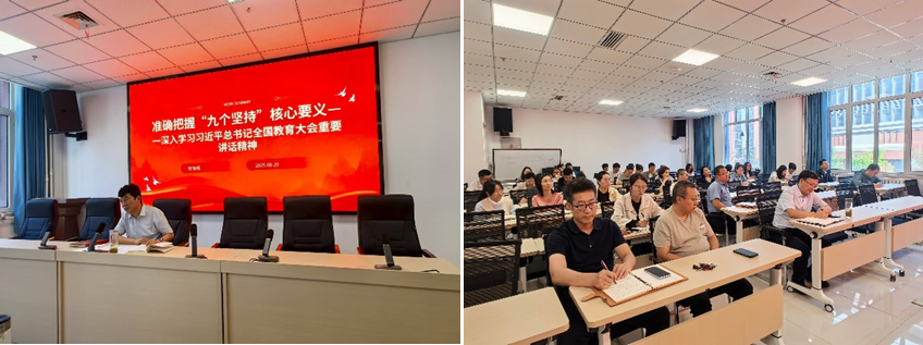 会上,学院党总支书记贺海明对新学期学院在政治理论学习及日常工作进行了部署安排,重点以《准确把握“九个坚持”核心要义——深入学习习近平总书记全国教育大会重要讲话精神》为题进行党课讲授。党课强调,党的十八大以来,我国教育事业之所以取得显著成就,根本就在于以“九个坚持”指导教育改革发展的实践,使教育事业中国特色更加鲜明,教育现代化加速推进。要求全体教师牢牢把握教育改革发展的“九个坚持”,不断增强贯彻落实“九个坚持”的自觉性和坚定性,要紧扣“为党育人 为国育才”的根本目标,强化实践教学环节,让学生在掌握专业技能的同时,筑牢理想信念之基。